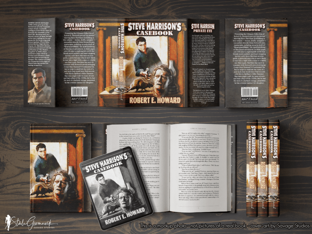 In these pages, you will enter a nightmarish world that blends weird mystery and heart-stopping horror, with Steve Harrison as your guide, a powerful man who is more likely to tear into a fight with a mace or a battle-axe than a gun. Harrison has more in common with Howard’s sword-swinging Conan than Hammett’s Continental Op, but he helps to establish the roots of a noir style that would later find success with Micky Spillane’s Mike Hammer. Harrison might walk the mean streets and back alleys of the 1930s, but he has the soul of a barbaric savage, possessed by the crimson instinct for slaughter.