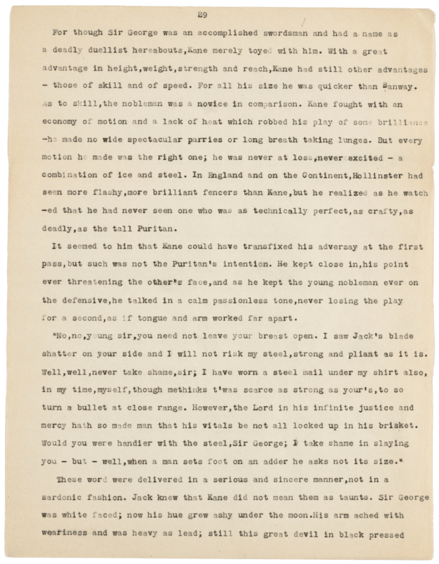 This story was originally written in 1929, titled ‘The Blue Flame of Vengeance’, and featured Solomon Kane. Howard failed to sell it, perhaps because it had no weird element, and hence WEIRD TALES would likely not take it. Howard rewrote it in 1932, changing the hero to Malachi Grim, changing the title to ‘Blades of the Brotherhood’, and shortening the story by a couple of pages. There is no record to show to which magazines this story was offered, if any.